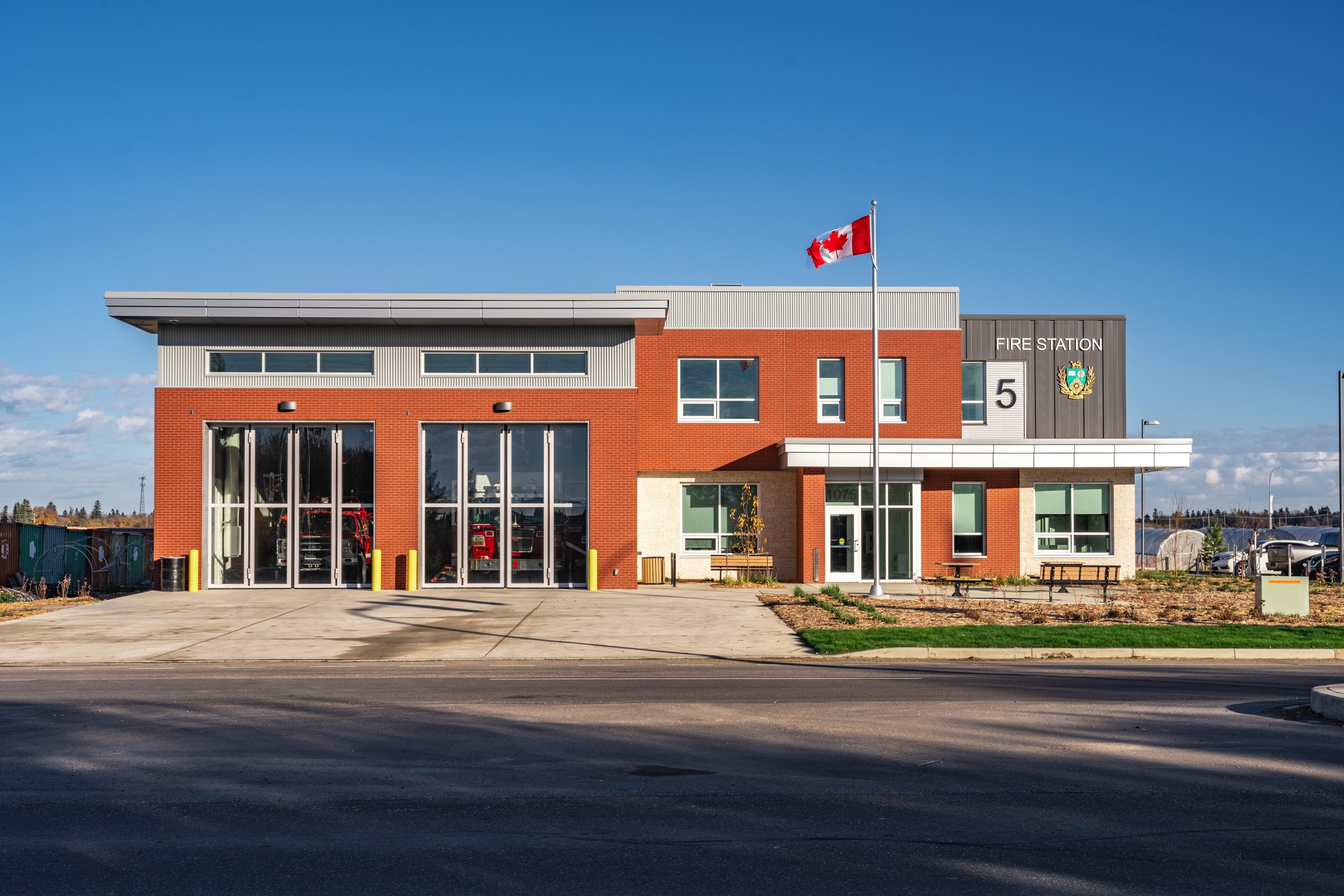 The fire station’s design prioritizes functionality and efficiency. The apparatus floor can accommodate one pumper truck and one aerial ladder truck, with adjacent spaces like hose drying areas, workrooms, mask washing facilities, and turnout gear rooms for quick access. Key facilities such as EMS storage, staff showers, an air compressor room, emergency generator room, and electrical and mechanical rooms are conveniently located near the apparatus bay. The main floor houses an entry vestibule, main office, classroom (which can also serve as a community room), meeting room, washrooms, fitness room, and janitorial facilities, while the second floor includes living quarters (dorms, kitchens, lounges), captains’ and inspectors’ offices, storage rooms, janitor closets, and a common study area. Accessibility to the apparatus floor is enhanced with the inclusion of a fire pole and a direct path to an internal stairwell. Additionally, an outdoor patio off the kitchen provides space for outdoor dining and barbecues. The fire station has been designed to meet the criteria for LEED Certification, emphasizing sustainability and environmental considerations in its construction.