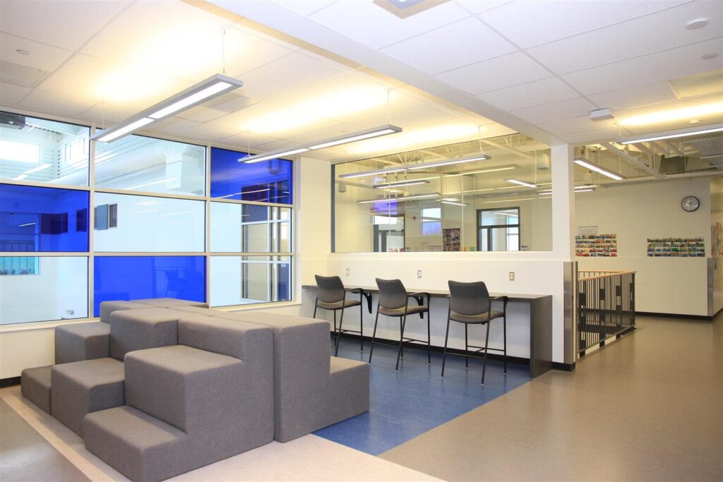 Flexibility was a key design component; stairways and corridors were creatively designed as break out rooms and flexible space. The main floor is highlighted by a “Carrefour” (Crossroads) space which is the heart of the school. This provides additional program space for École Centennial students that can be used for a variety of activities when the school’s shared gymnasium is in use.