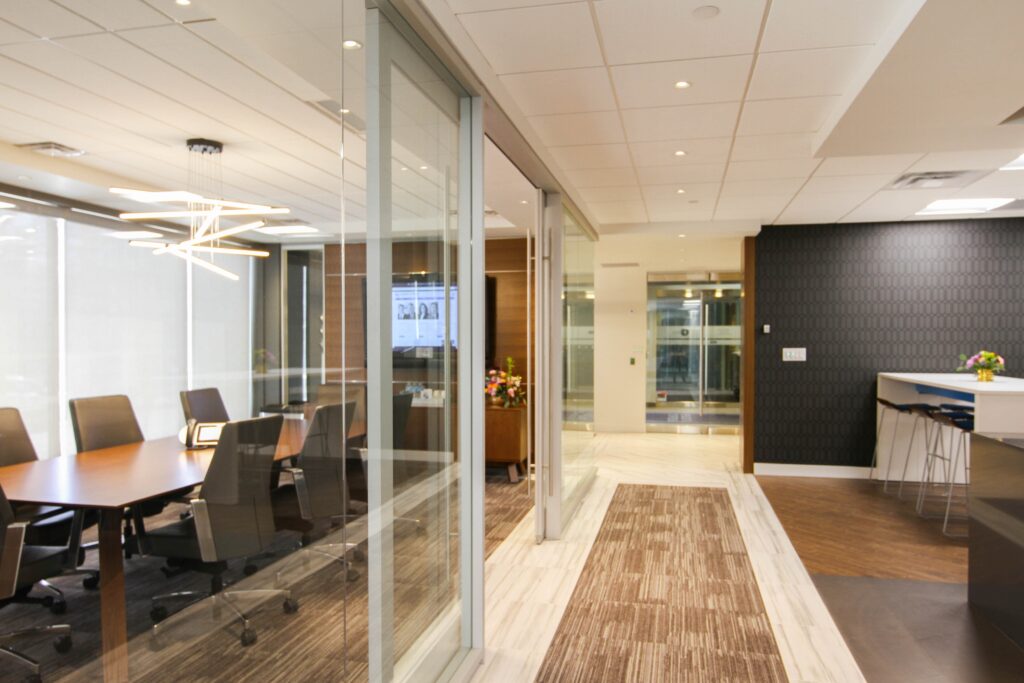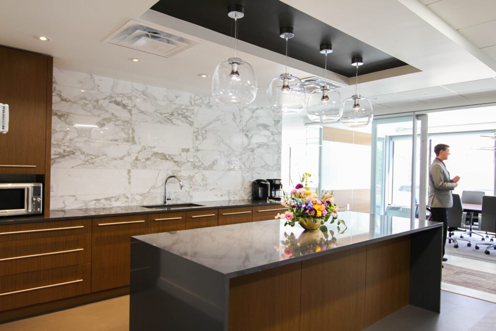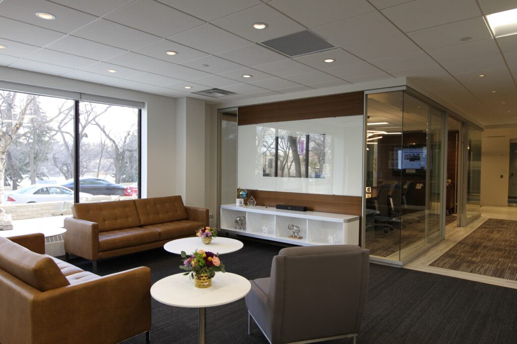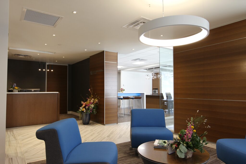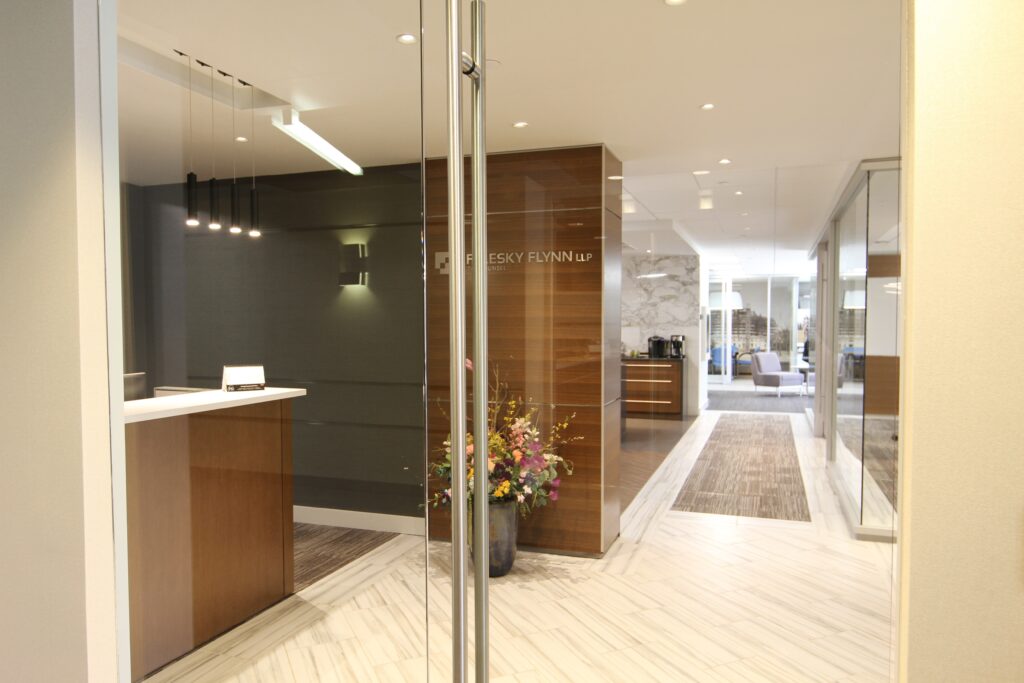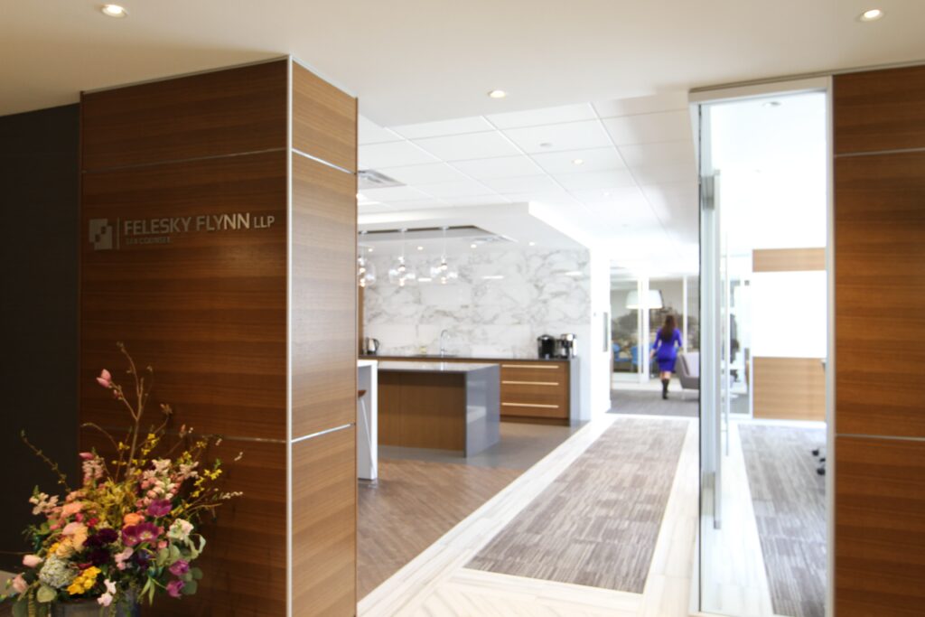 Felesky Flynn LLP is located in the heart of downtown along the much loved South Saskatchewan River valley. The concept for this modern and sophisticated office was to create a place for staff to both to meet with clients and to host receptions throughout the year. It features a warm yet classic palette of walnut wood contrasted with tones of grey, black and white. Contrast can be seen through the layering of the texture found in the textiles, wall coverings, natural marble stone, and glass. To tie in their corporate brand the designer infused accent in bright blue throughout the space through furniture and accessories. Creating various public and private zones within the space while still maintaining an open concept feel was critical to the function of the firm. The offices were constructed using an architectural wall system and can be adapted for future growth or changes. Through the use of art and graphic wallpaper, an element of Saskatoon history was incorporated to brand this location as unique from the head office in Edmonton. The expansive views of the riverbank provide ample natural daylight the space to create professional office space that is both modern yet classic.