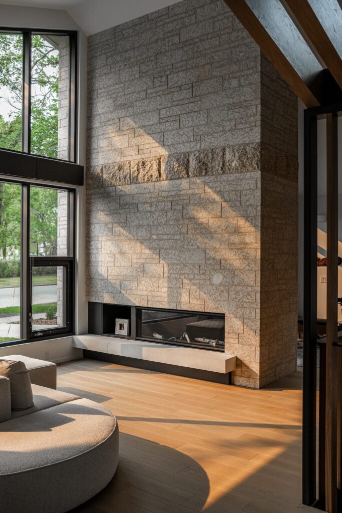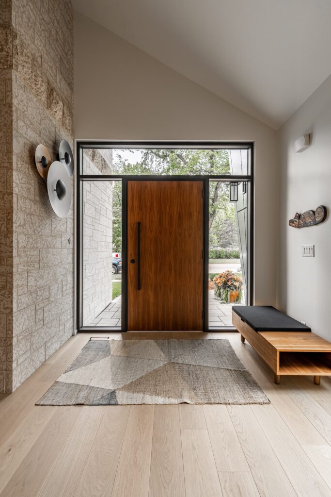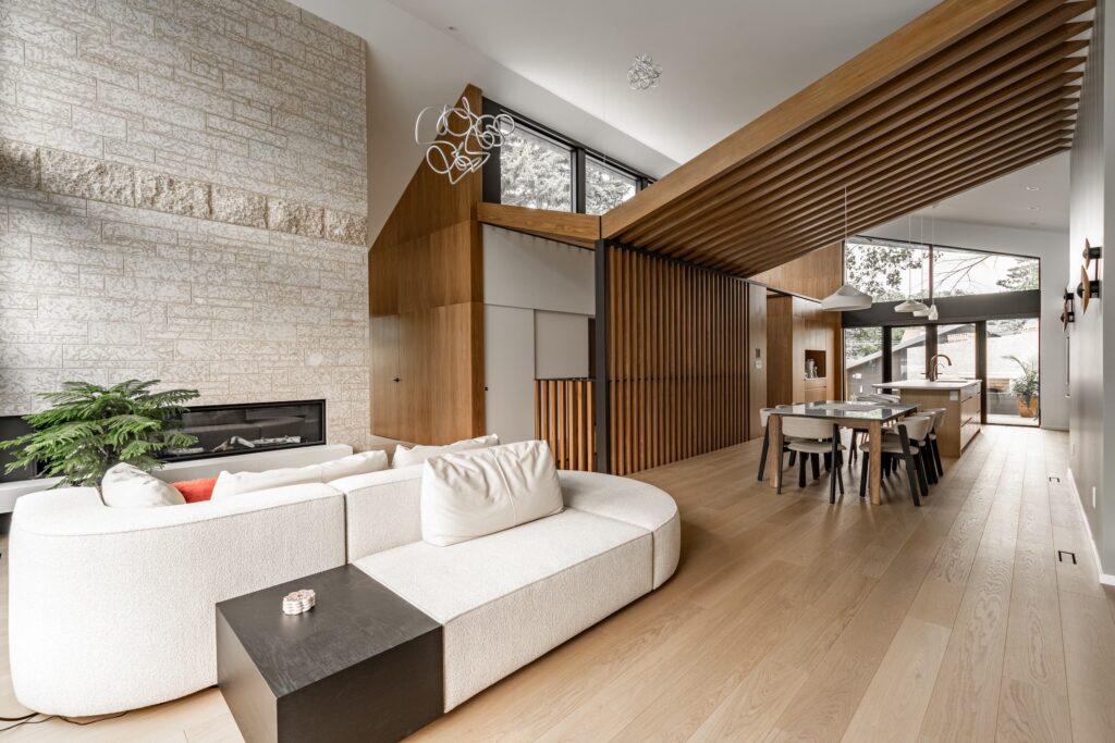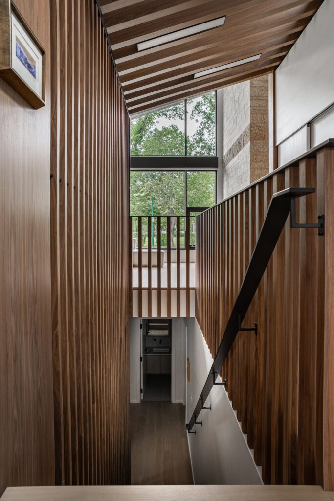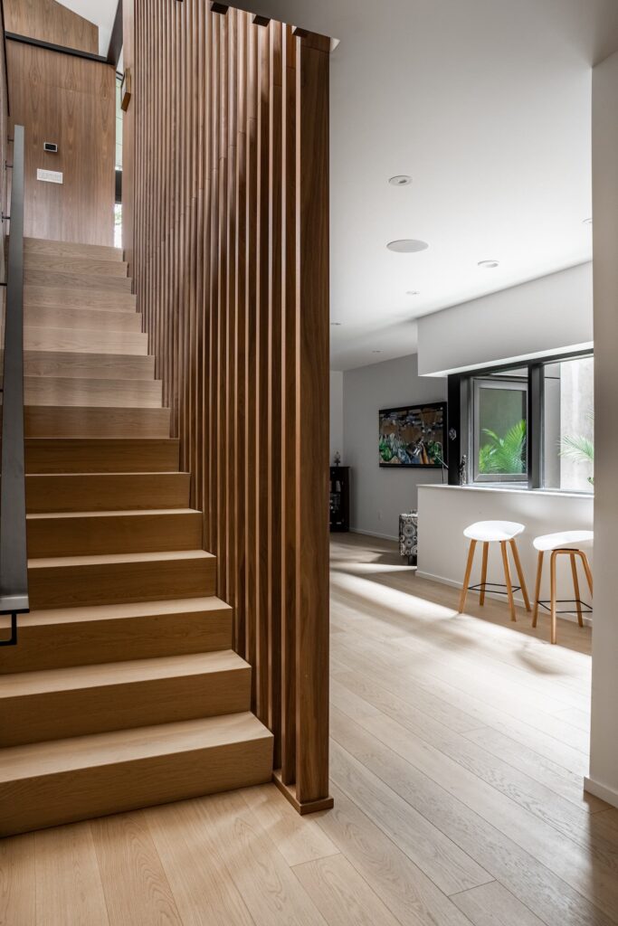 Both inside and out, the choice of materials revolves around wood and glass as foundational elements. A prominent feature is the Tyndall stone, complemented by a combination of metal, Venetian plaster, textiles, porcelain tile, and quartzite, creating a harmonious blend of textures and surfaces that contribute to the residence’s distinctive character.