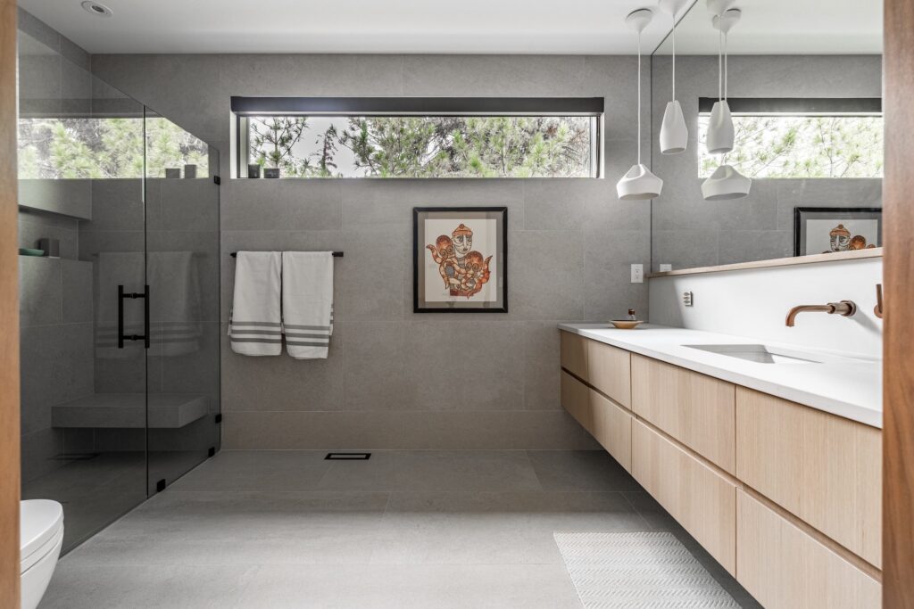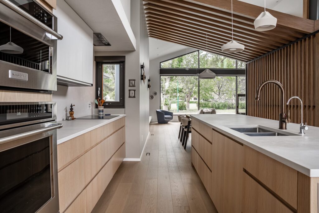 The design meticulously balances the need for natural light with the desire for privacy. Referred to as ‘the Turtle’ by its owner, the metal-finished ‘shell’ offers both interior and exterior shade from the sun’s path, strategically placing windows to align with picturesque views while preserving privacy. Noteworthy are the north-facing clerestory windows, which invite generous, diffused northern light, and perpendicular windows in the living room and kitchen that brighten even the darkest corners. Efforts to preserve a line of Swiss Stone Pine trees along the north property line further enhance the living spaces with lush green vistas.