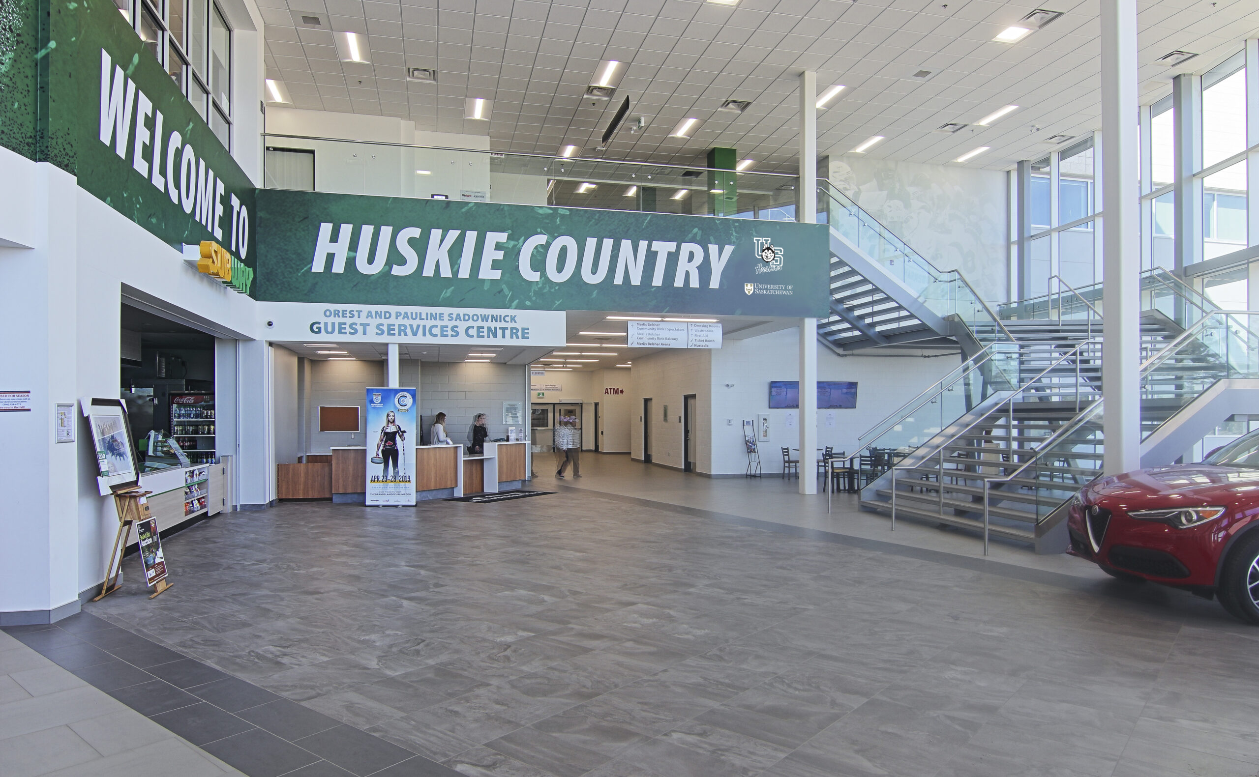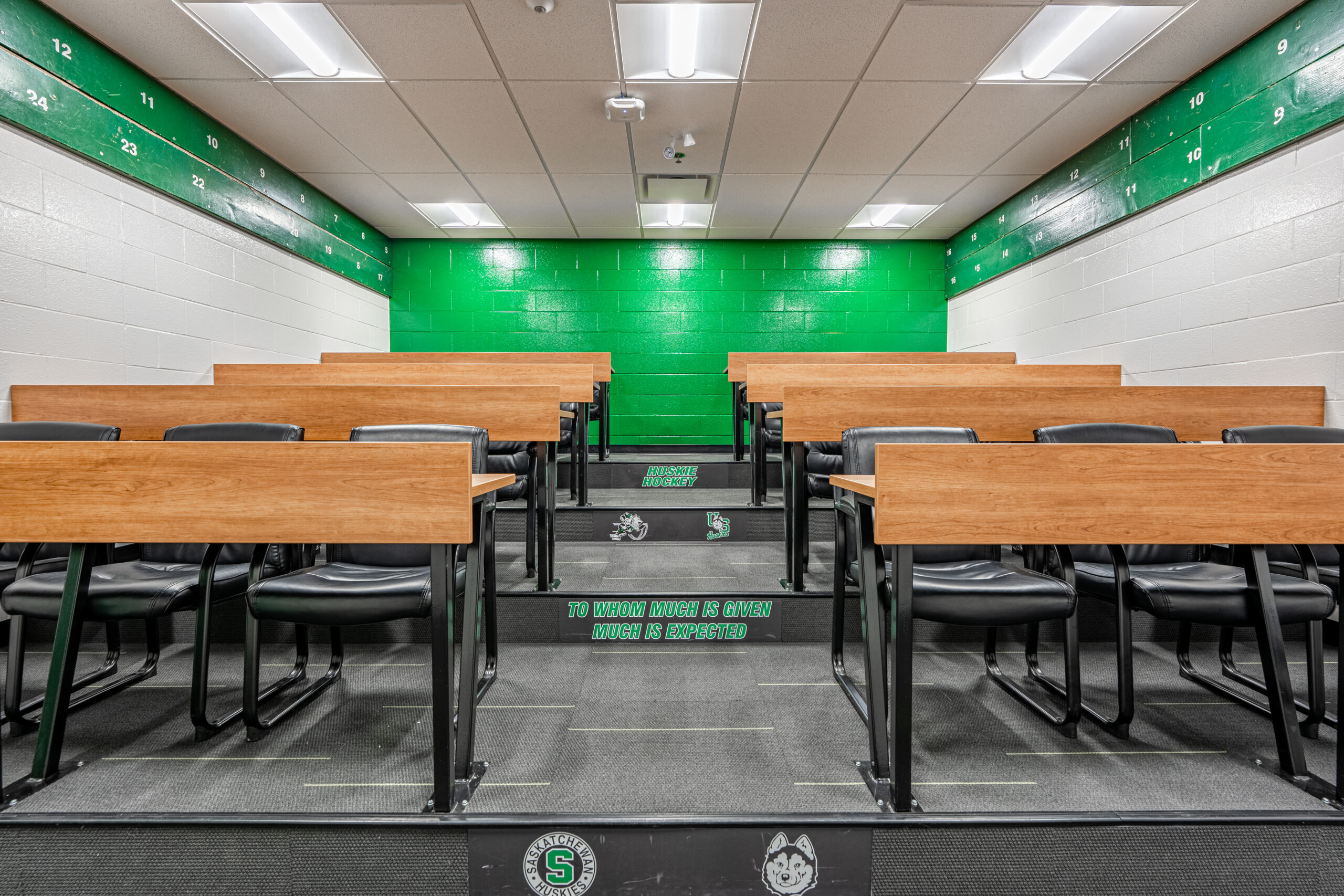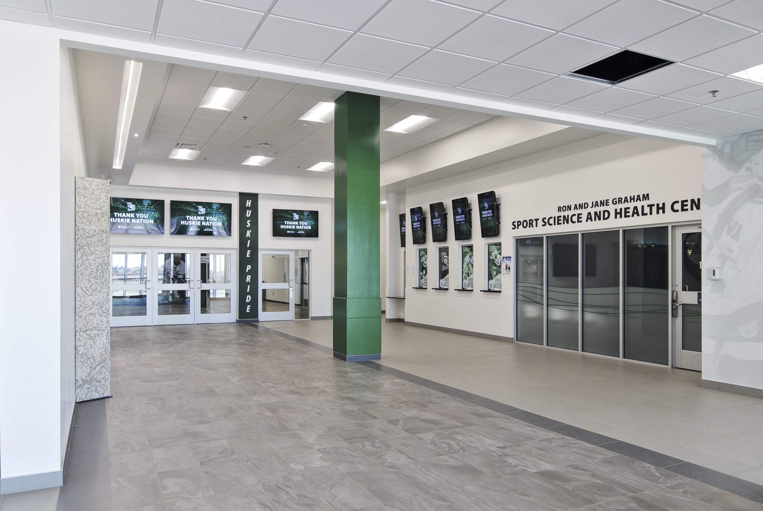 The large two-storey glazed lobby is the focal point of the building, featuring a central reception area, a pro shop, concession, and a double gymnasium with twin NBA-sized basketball courts and Huskie basketball men’s and women’s suites. The upper level includes administration, the Ron and Jane Graham Sport Science and Health Centre with a high performance research lab, box office, concession, and a large lounge with views into the main spectator rink.