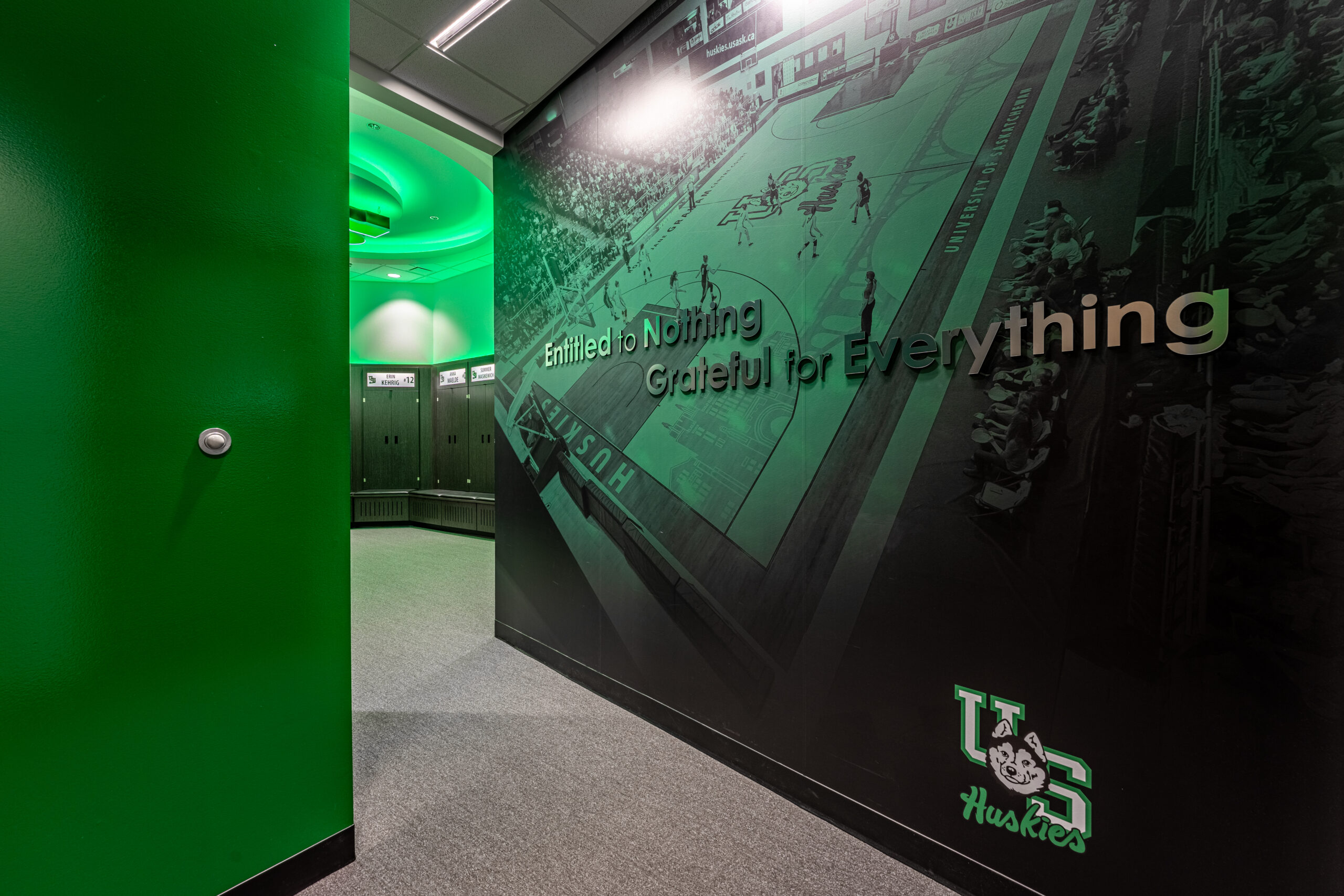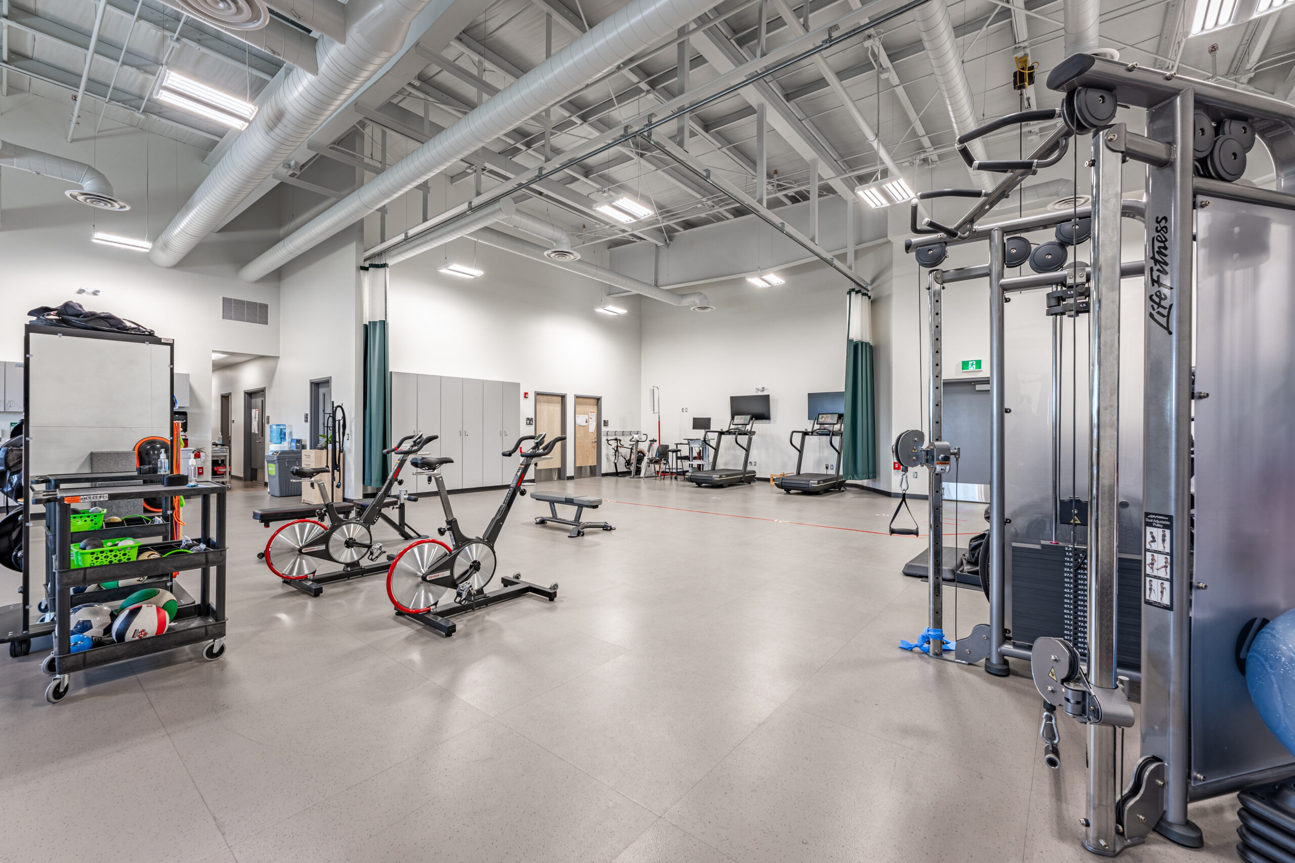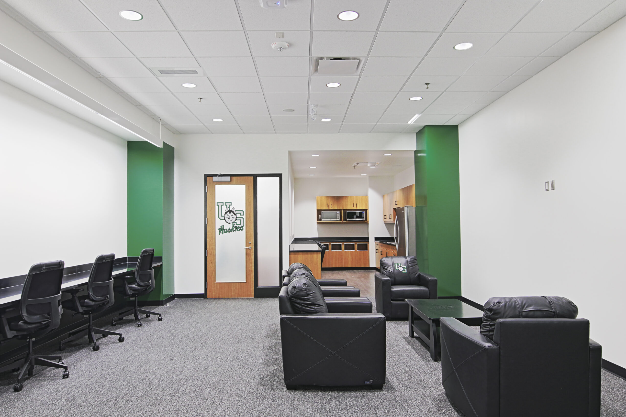 The large two-storey glazed lobby is the focal point of the building, featuring a central reception area, a pro shop, concession, and a double gymnasium with twin NBA-sized basketball courts and Huskie basketball men’s and women’s suites. The upper level includes administration, the Ron and Jane Graham Sport Science and Health Centre with a high performance research lab, box office, concession, and a large lounge with views into the main spectator rink.