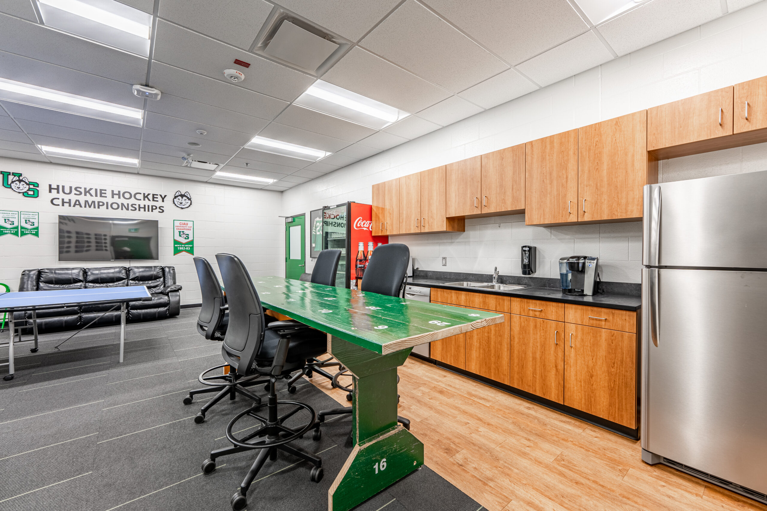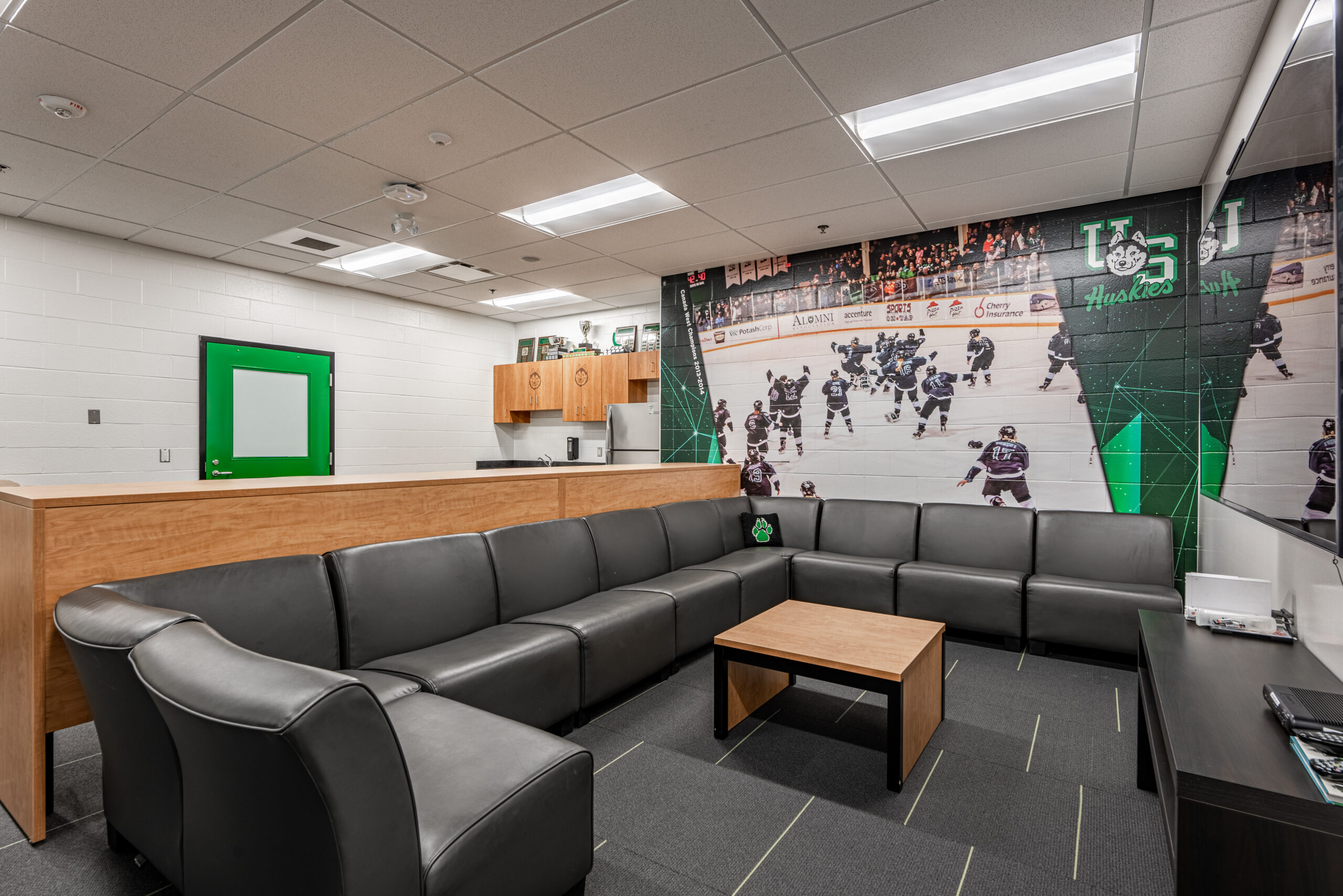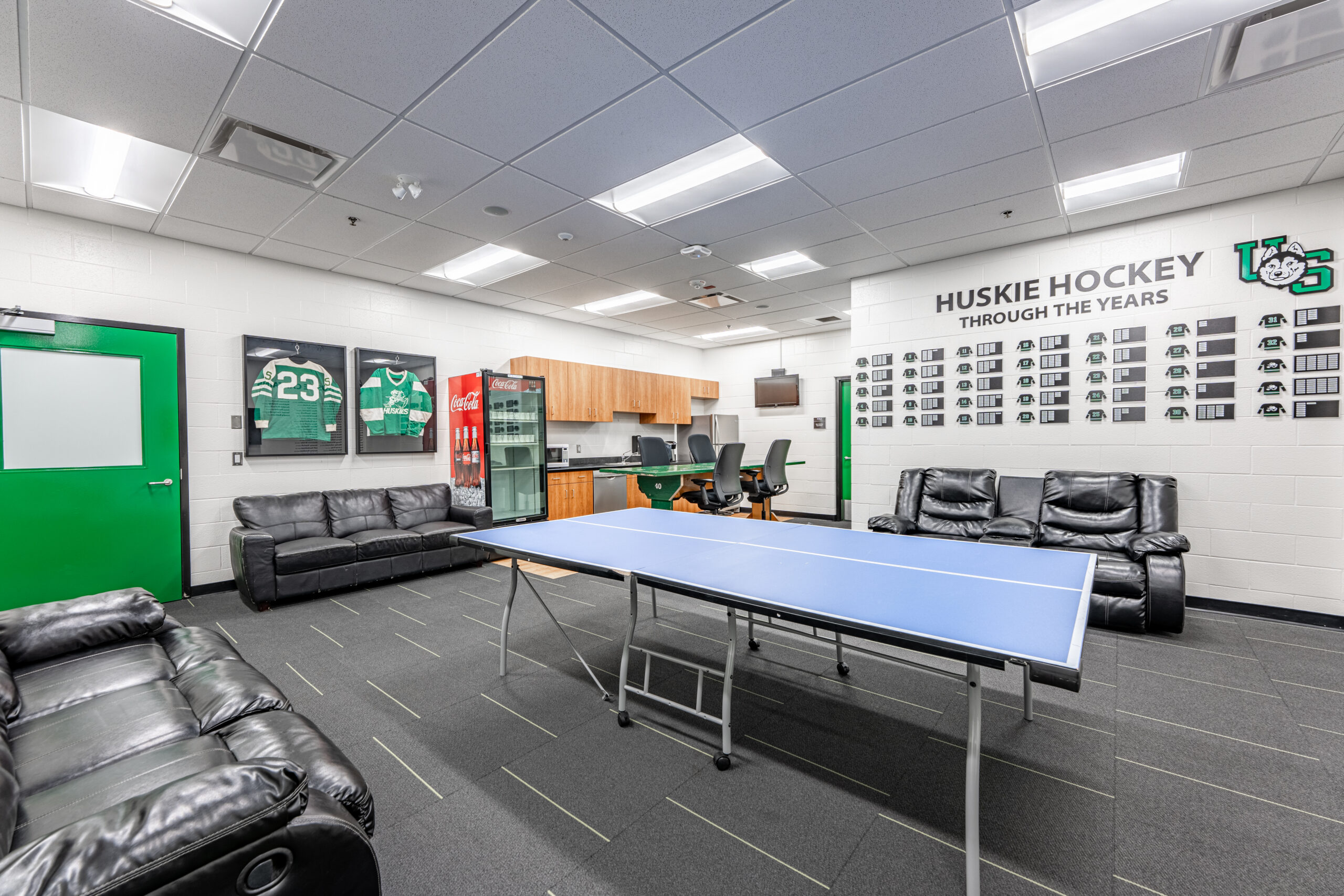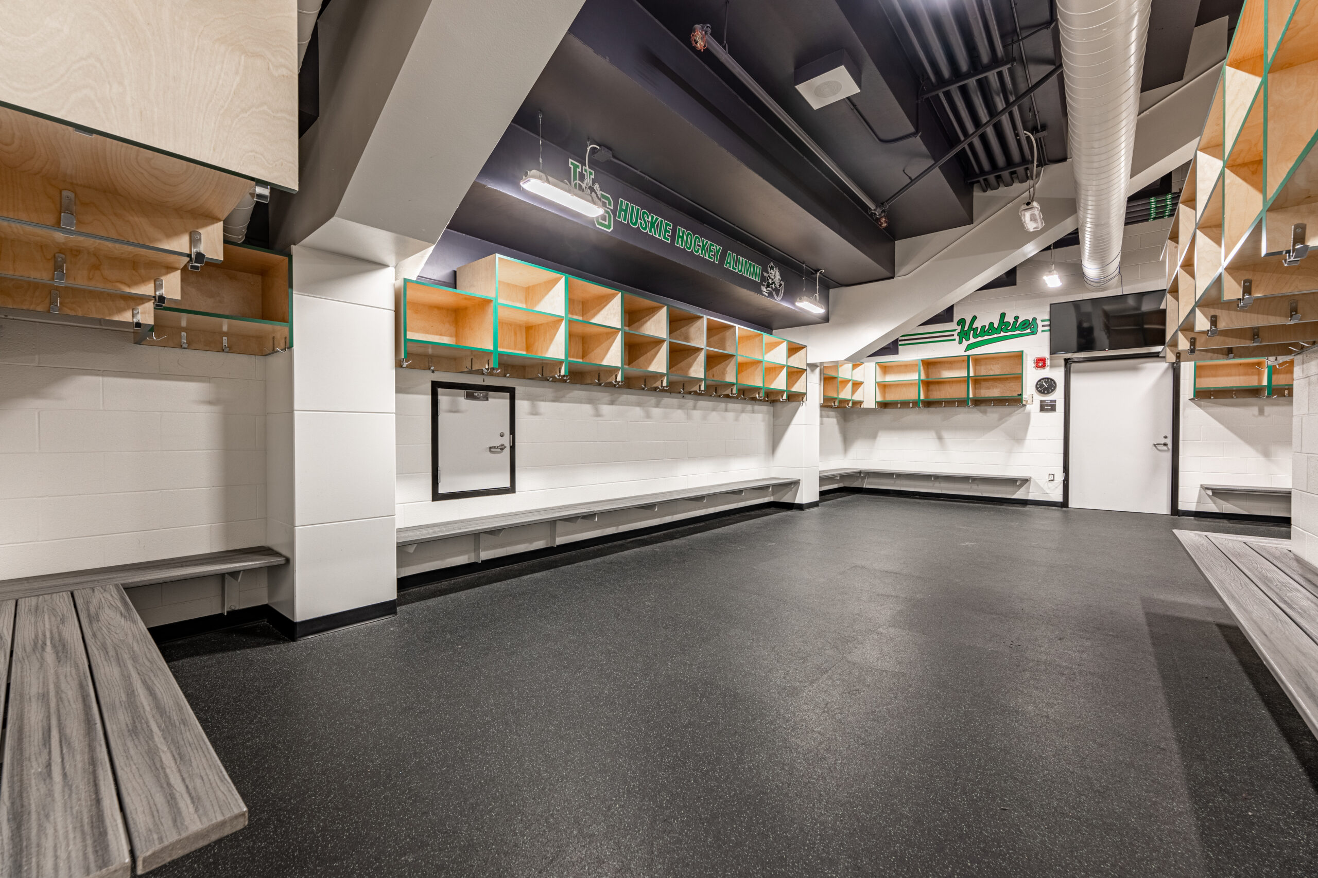 The sports facility features two ice rinks that are designed for year-round use. The Main Spectator Rink is a hybrid dimension (200’ x 90’) that is 5’ wider than a standard NHL rink (200’ x 85’). The spectator rink has a seating capacity of 2,700 with the ability for future expansion to 3,200 spectators and can also be used for concerts, community events, and other spectator events. The main spectator rink features the Huskie hockey men’s and women’s suites, team facilities as well as the Huskie soccer men’s and women’s dressing rooms along with space designated for Campus Recreation. The Community Rink is a 200-seat NHL-sized arena that houses dedicated dressing rooms for the U18 AAA teams as well as 12 additional spacious dressing rooms for minor hockey and campus recreation teams.