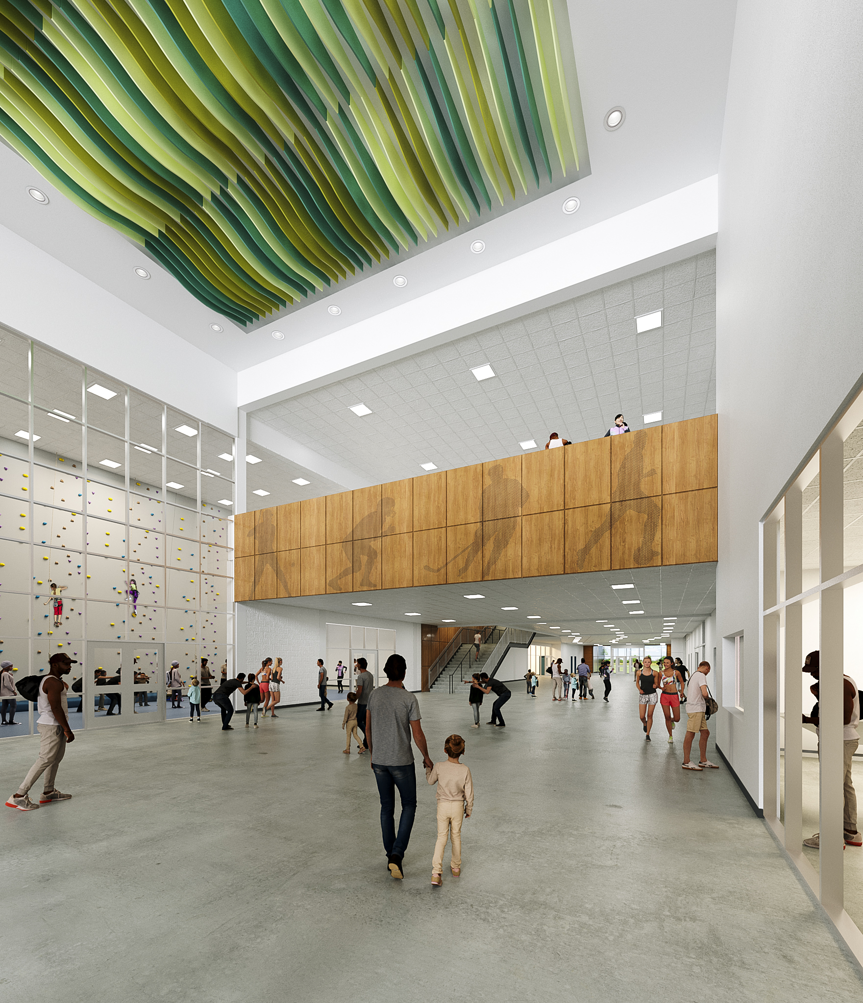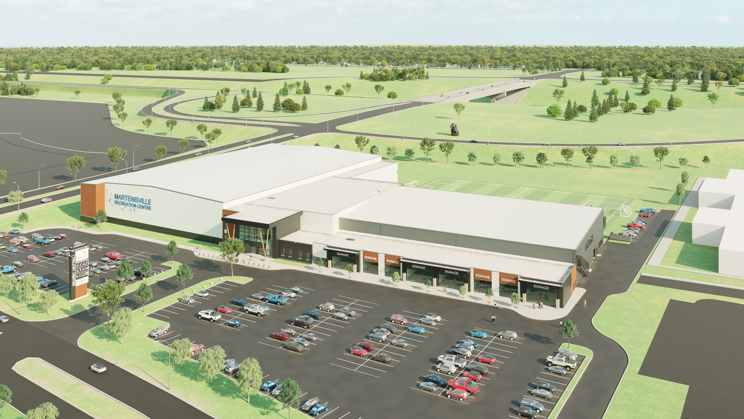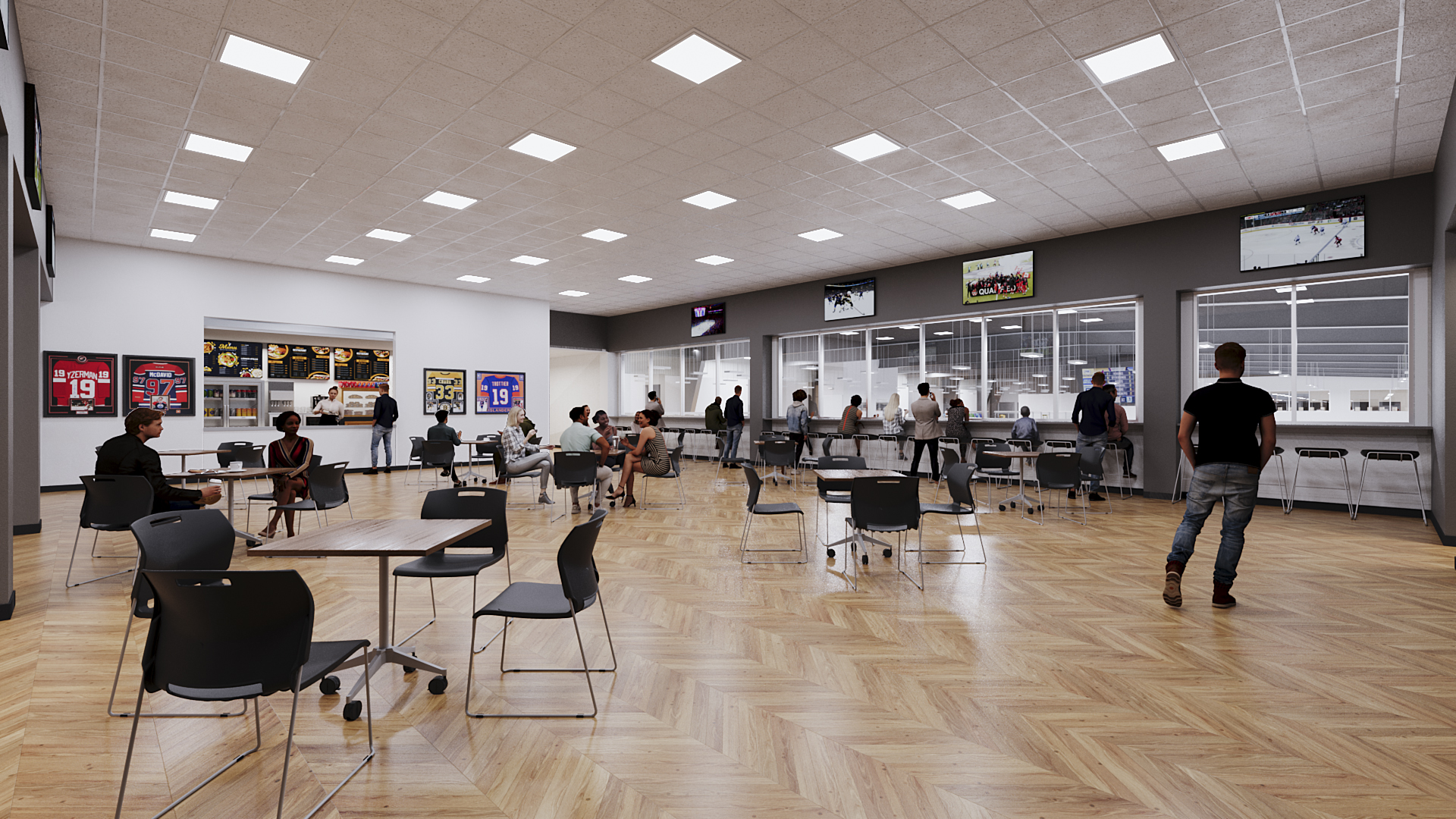 The first phase of the project includes a hockey arena with a leisure ice surface. It will also include dressing rooms, a climbing wall, an indoor playground, a spectator lounge, a seating area, and a