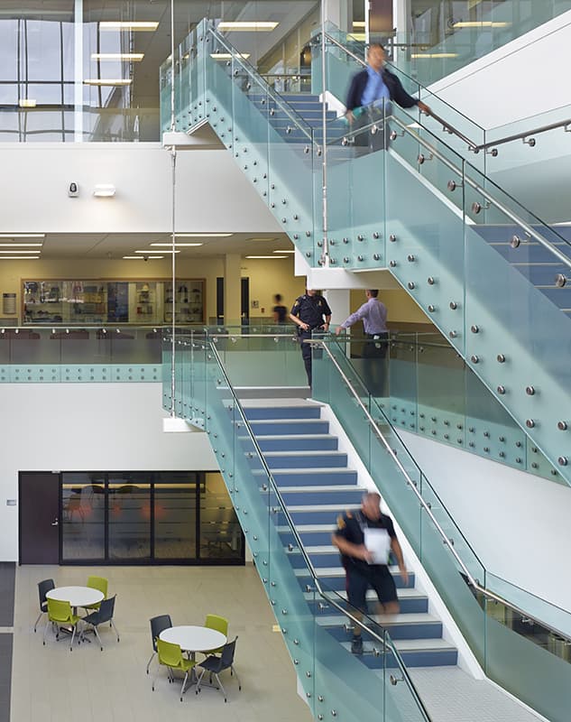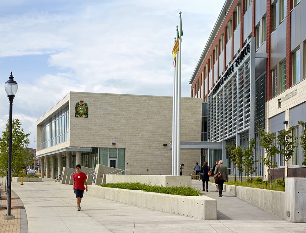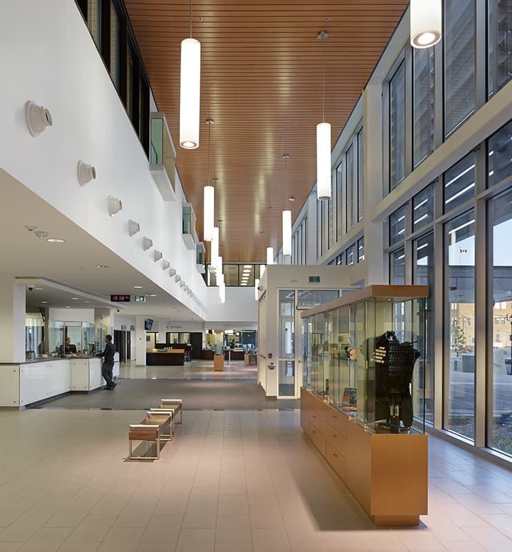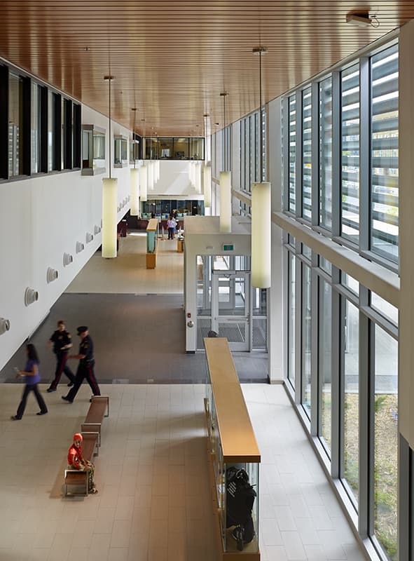 Going beyond its role as an operational centre, the SPS Headquarters was conceived with the broader community in mind. The design emphasizes creating a welcoming, safe environment for the public while ensuring the security required for modern police activities. The facility includes specialized components tailored for a major police headquarters, such as secure detention areas, forensics labs, a complete canine unit, a 911 communications center, education and training facilities, and a full indoor training range for firearms. These secure and specialized spaces are complemented by areas designed to cater to the needs of the public and civilian staff through common areas and office spaces situated separately from secure zones.