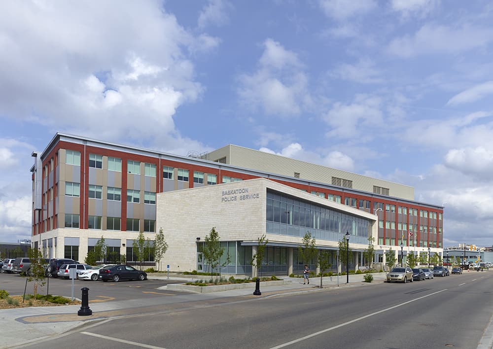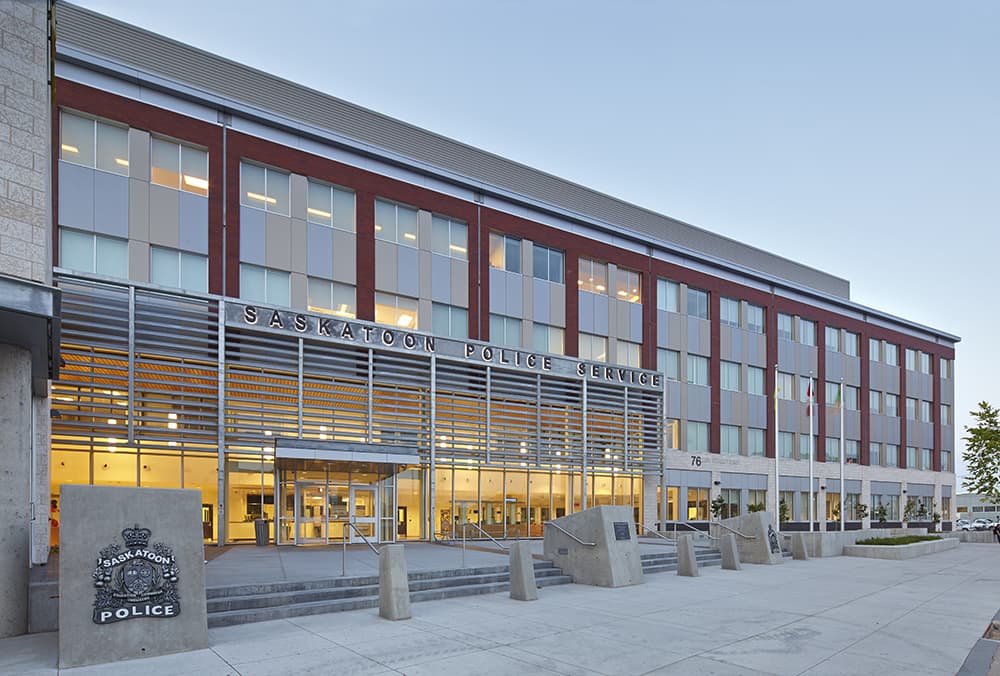 The Saskatoon Police Service (SPS) Headquarters is a purpose-built facility designed to accommodate the anticipated growth of SPS personnel over the next 10-15 years, accommodating up to 800 staff members. It is strategically located to provide efficient access to all areas of the city, serving as a central presence. The facility encompasses both open public areas and secured spaces for SPS use, aiming to maximize usable space.