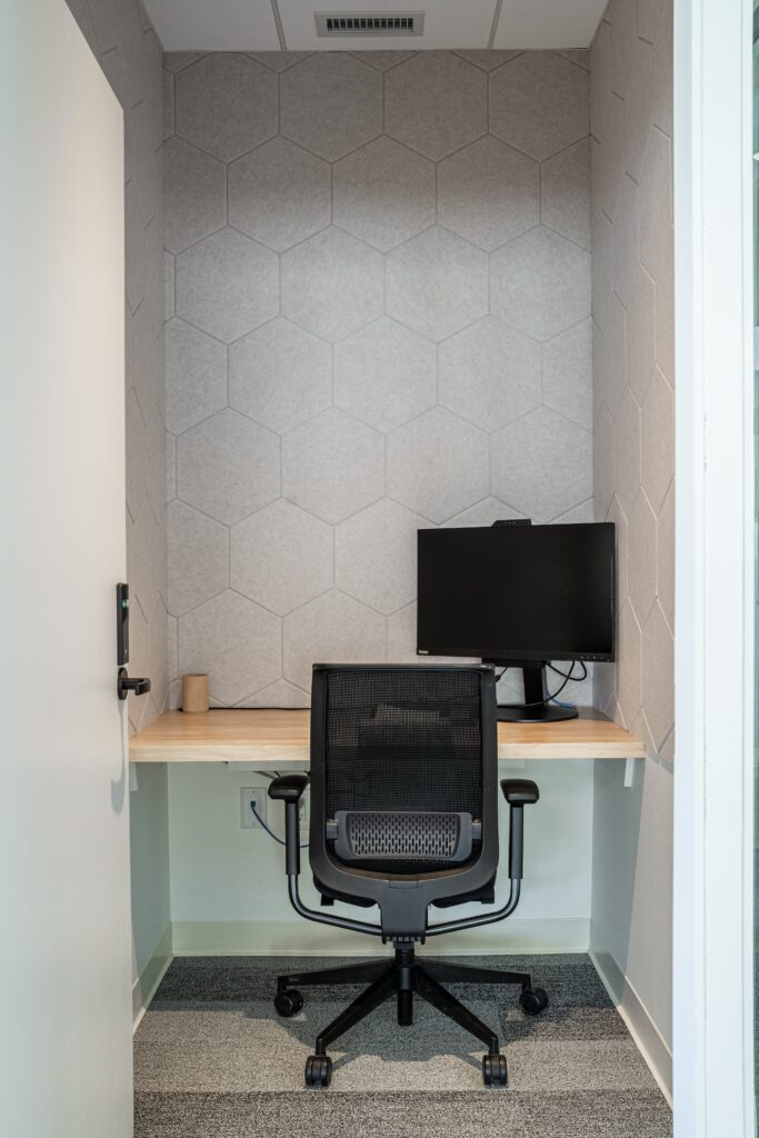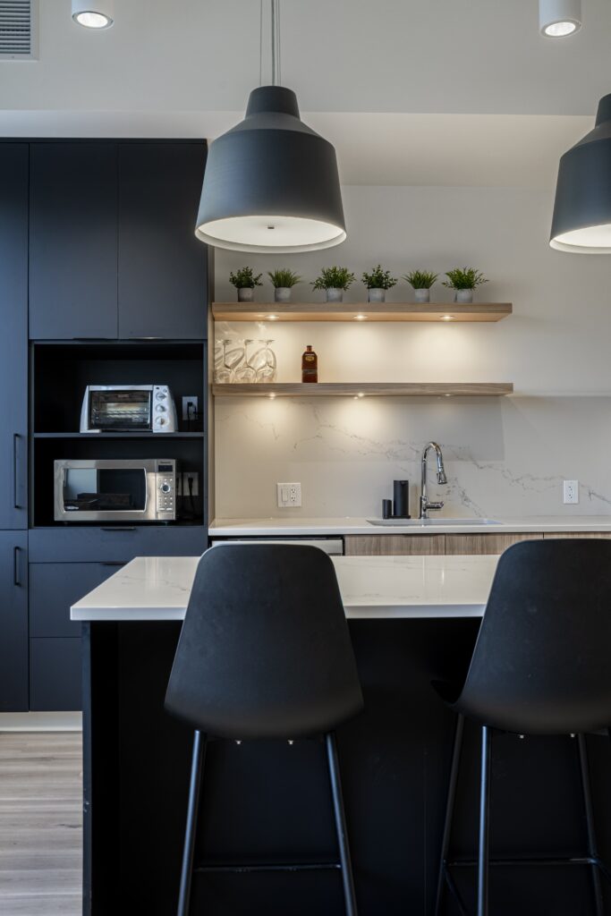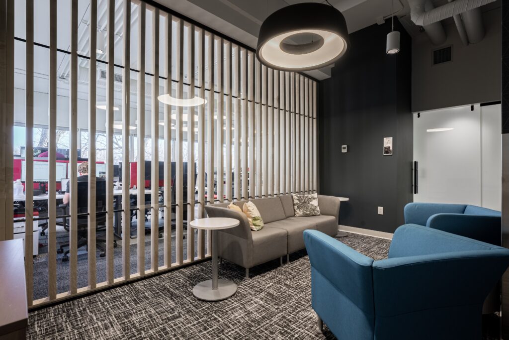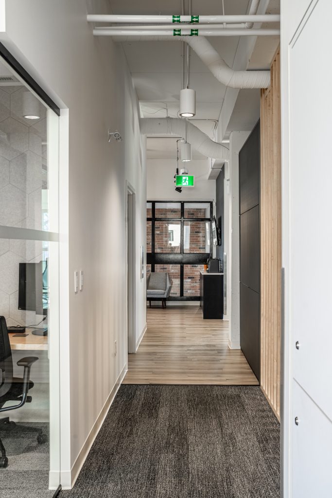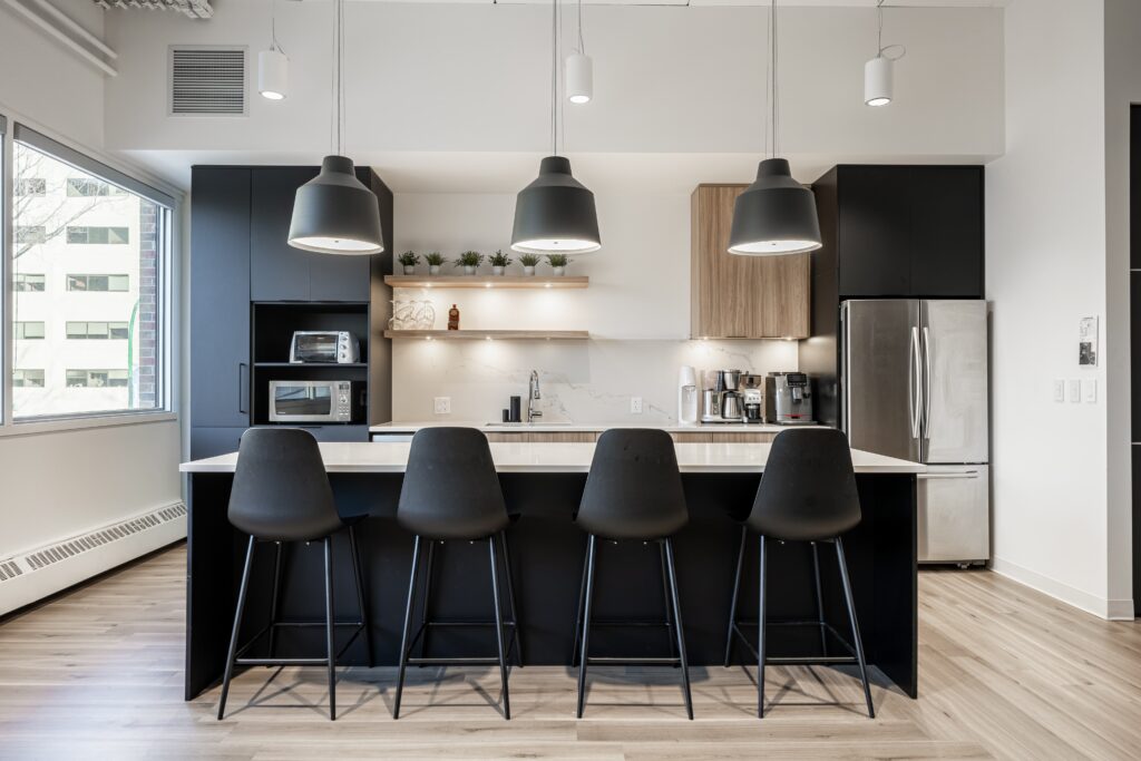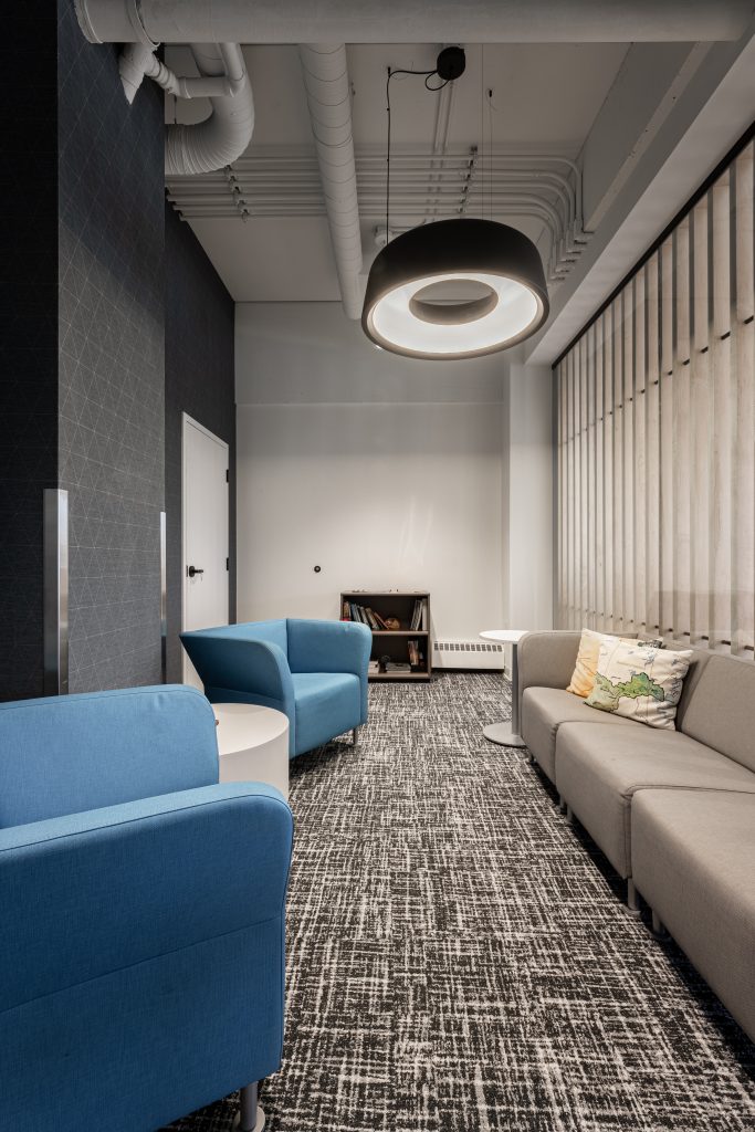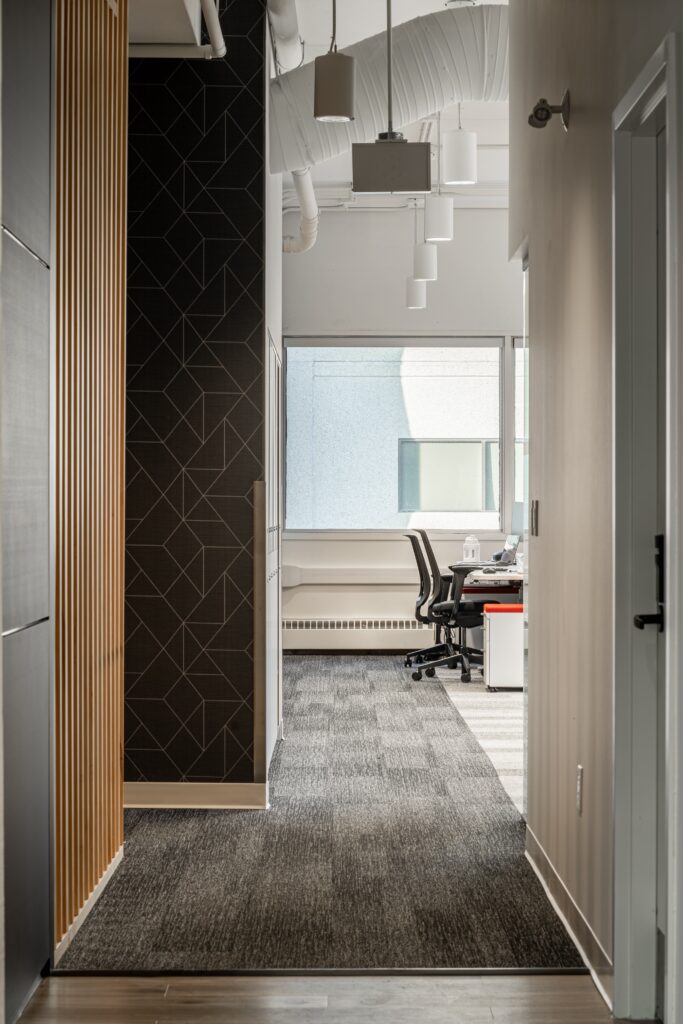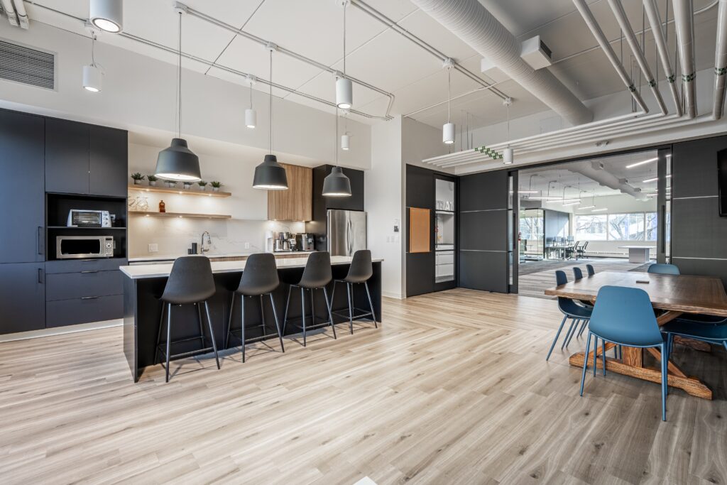 Balancing open office work areas with private meeting rooms and phone booths was critical to giving employees workspace options. The staff lounge space is a modern space to relax and collaborate with peers. It included large oversized doors to open the space for larger events and gatherings. The result is a modern office filled with natural daylight, balanced with dark rich tones and accented with warm wood finishes & features. The team developed a palette that is professional and neutral yet full of depth, texture, and visual interest. Creating flexible workspaces that allowed for future growth was key to the project and future planning for Urban Systems.